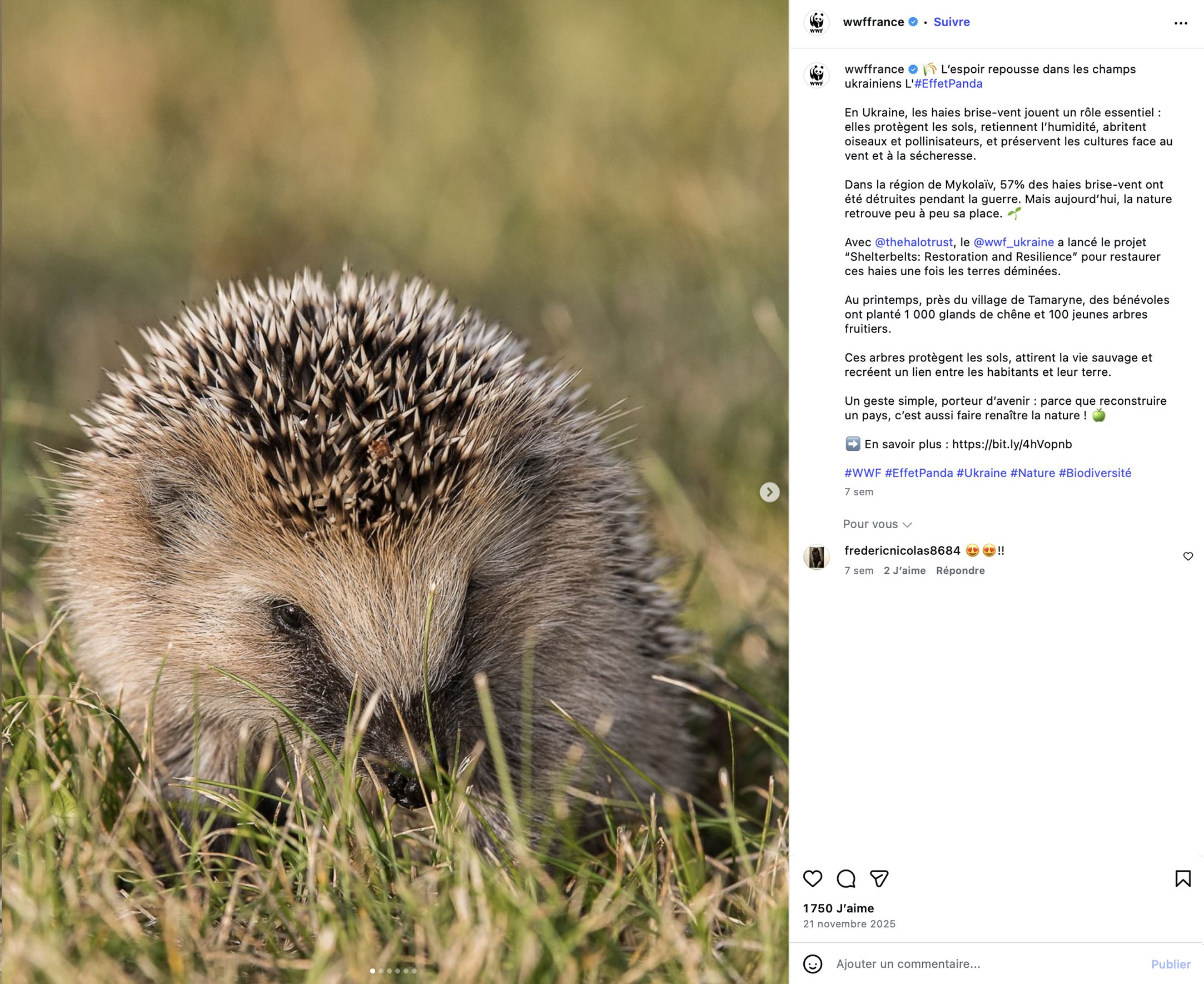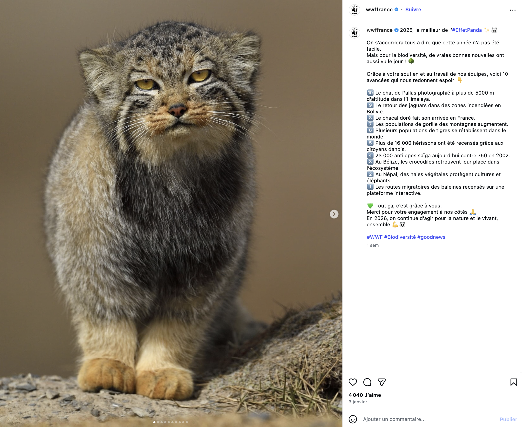 Depuis 2017, nous signons chaque semaine L’Effet Panda, un article web à l’angle résolument optimiste, mais toujours ancré dans les faits. En valorisant les succès concrets du WWF, nous montrons que la conservation fonctionne. Une écriture exigeante pour célébrer les victoires du vivant. Depuis peu, des capsules vidéo au format réseaux sociaux viennent prolonger le dispositif, pour donner encore plus d’écho aux bonnes nouvelles et les faire vivre de manière immersive.